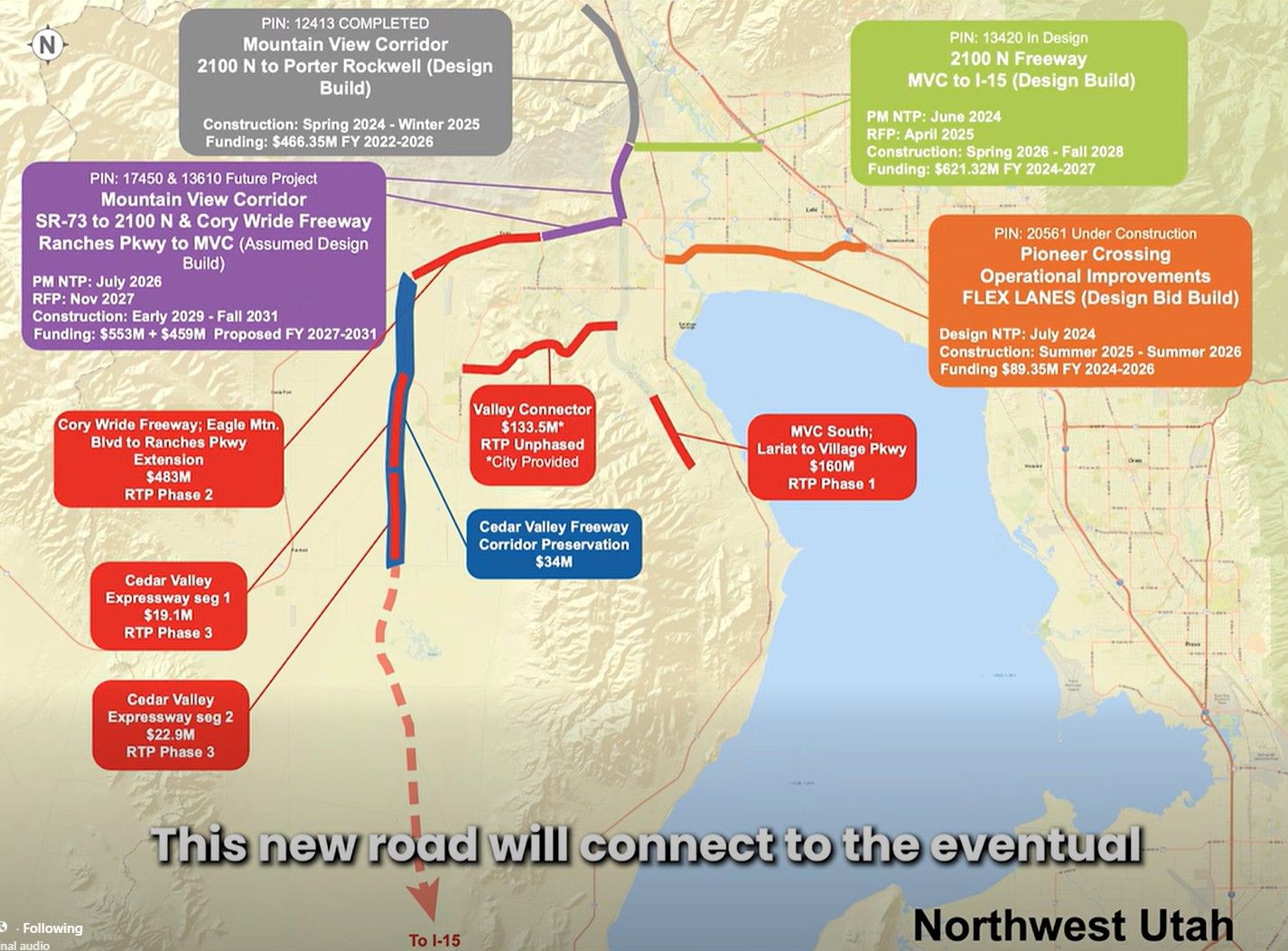 This is the big one for residents here. UDOT has committed funding to build a new freeway — with frontage roads — along Cory Wride Highway from Mountain View Corridor south to Ranches Parkway in Eagle Mountain. Construction isn't expected to begin until around 2029, but the money ($459 million in proposed funding) is attached and the project is in the pipeline.