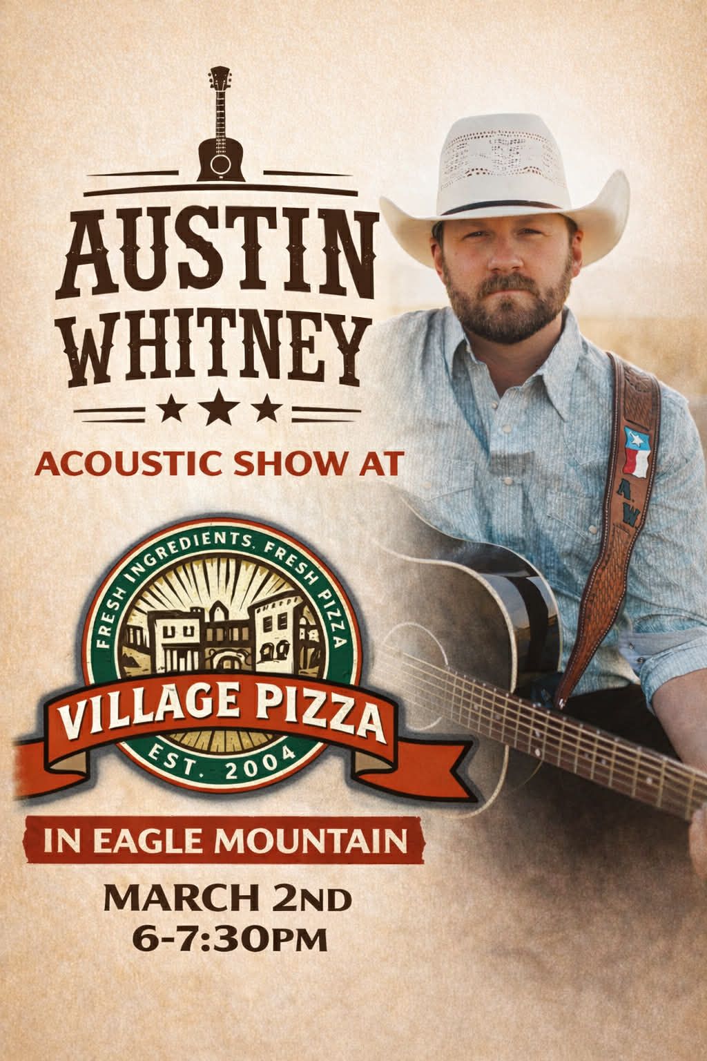 If you're reading this Monday morning, this one is today. A great chance to support local student musicians. Details →Austin Whitney — Free Acoustic Show — 6:00–7:30 PM | Village Pizza, Eagle Mountain